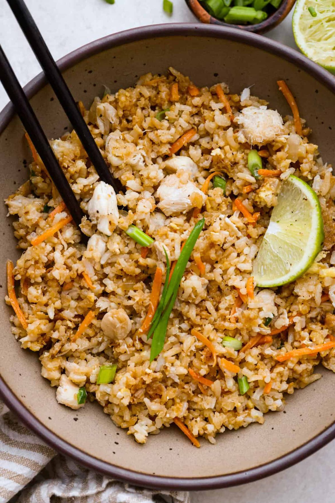 - Add: Season with onion powder, salt, and pepper, then add the drained crab meat to the wok. Stir to combine. Then, stir in the soy sauce and squeeze the juice of a lime. Toss to combine. Garnish with green onions and lime wedges, and enjoy!