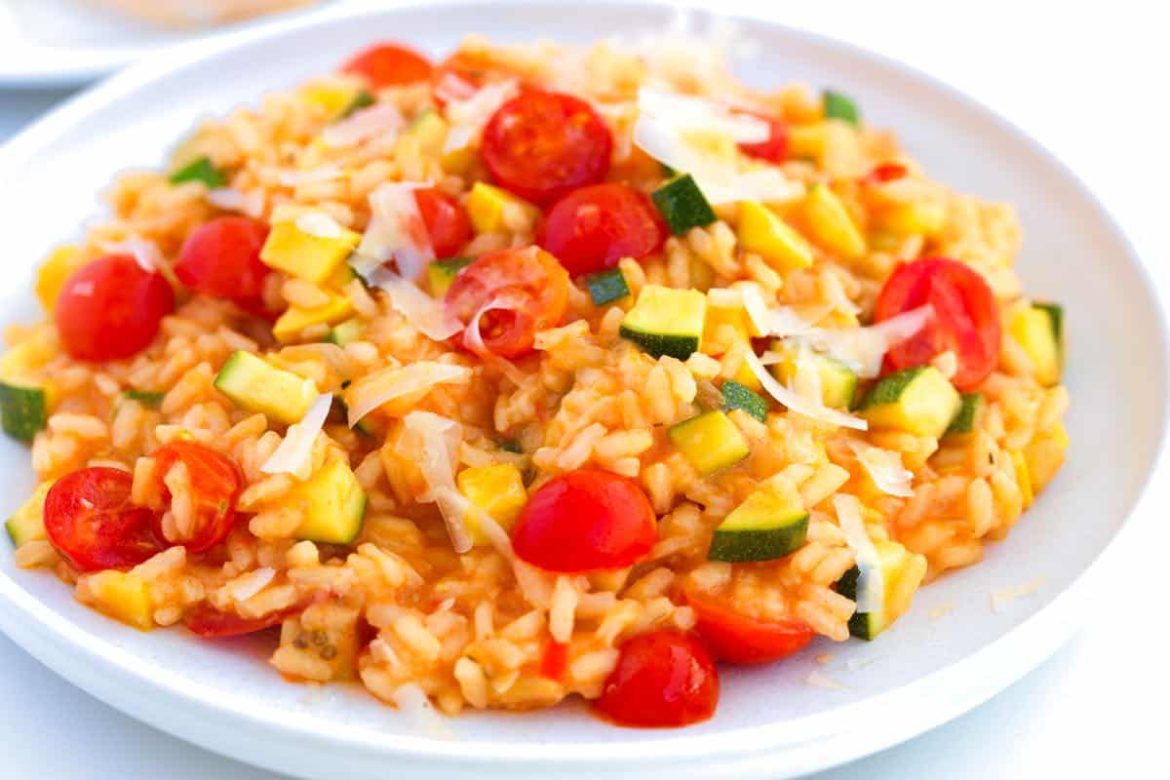 - Part 2, finish when ready to serve: Return the rice to your wide pan with chopped zucchini/yellow squash and a splash of broth. Stir often, adding more broth as needed, until the risotto is creamy and the rice is just tender. Season with salt and pepper, stir in chopped tomatoes, then finish with butter and Parmigiano-Reggiano.